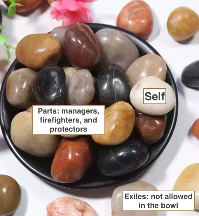 Petra helped me to visualise the parts using a bowl of rocks. The white rock was the self (me), then all of the parts piled around it, but the exiles were completely blocked from getting into the bowl and sat alone on the outside.