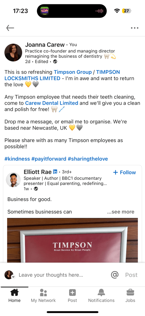 On seeing the post I instantly clicked to repost it, but felt compelled to pay the kindness forward. So, I reposted offering all Timpson employees a free teeth clean at Carew Dental. It felt amazing to share the love.