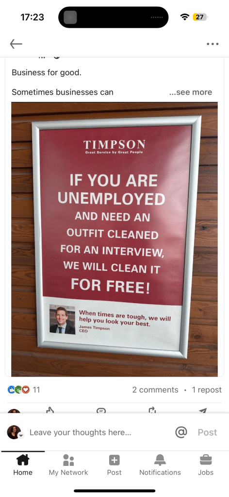 I saw a LinkedIn post earlier this week where Timpson were offering free dry cleaning to anybody unemployed who needed a suit cleaning for a job interview.