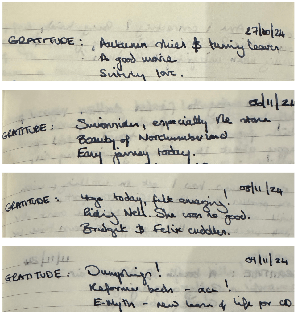 I’ve journalled daily for the past 12 years, and over the past year I added gratitude journalling into my nightly writing. This is so simple: you select your top 3 things about the day and jot them down as 3 bullets.